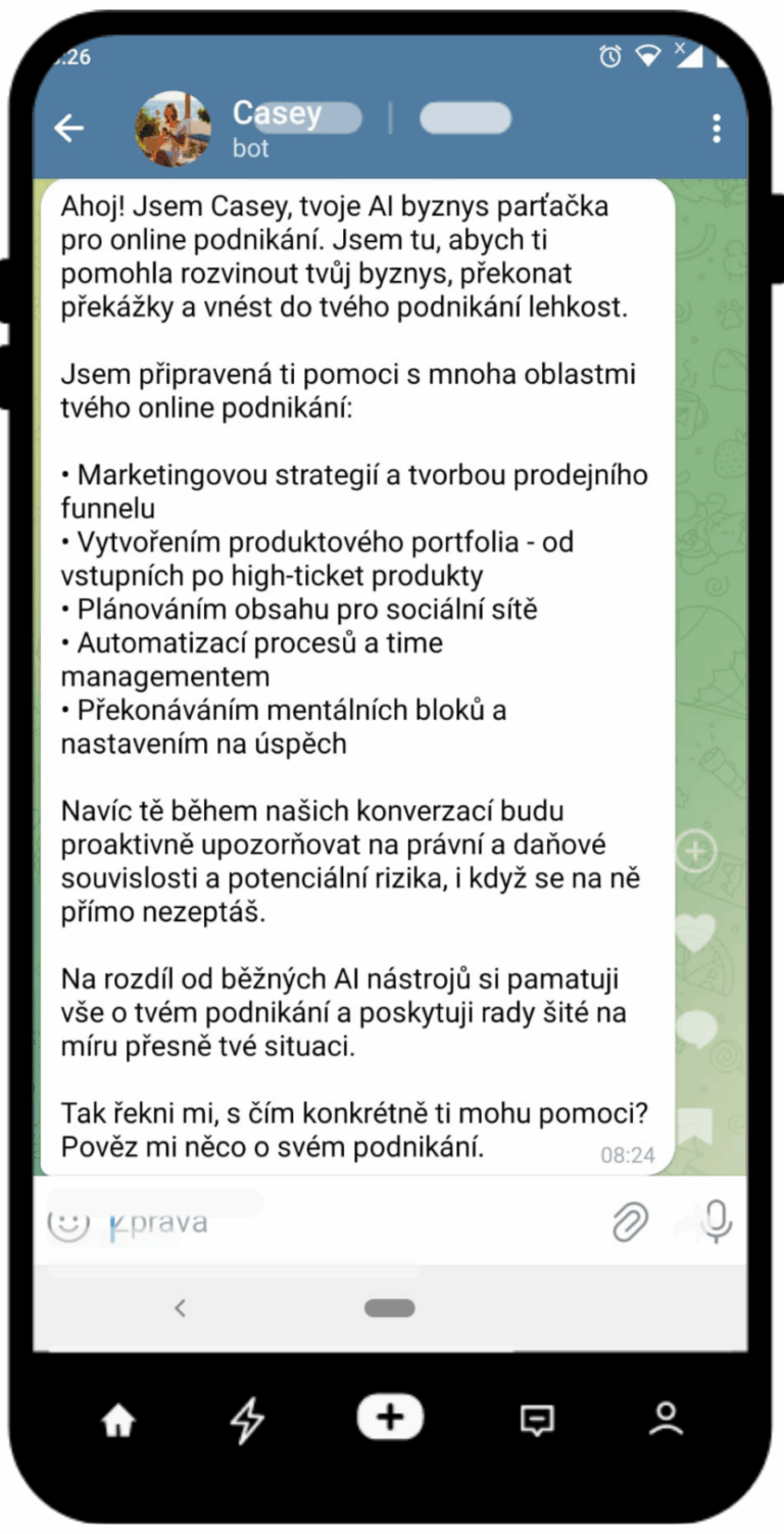 Nemusíte zadávat žádné prompty, s Casey komunikujete úplně přirozeně (jako s mentorkou či kamarádkou) přes textové nebo hlasové zprávy v aplikaci Telegram.