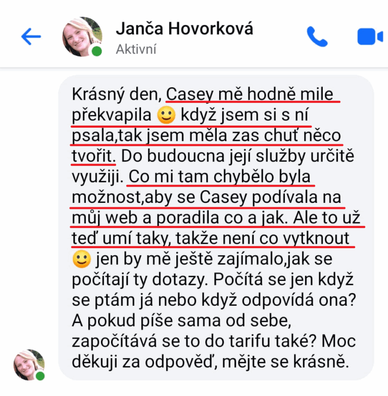 Casey vyniká tím, co běžné AI nástroje neumí. Její hodnotu poznáte už během prvních zpráv. Není to jen chatbot, ale skutečná opora vašeho podnikání.